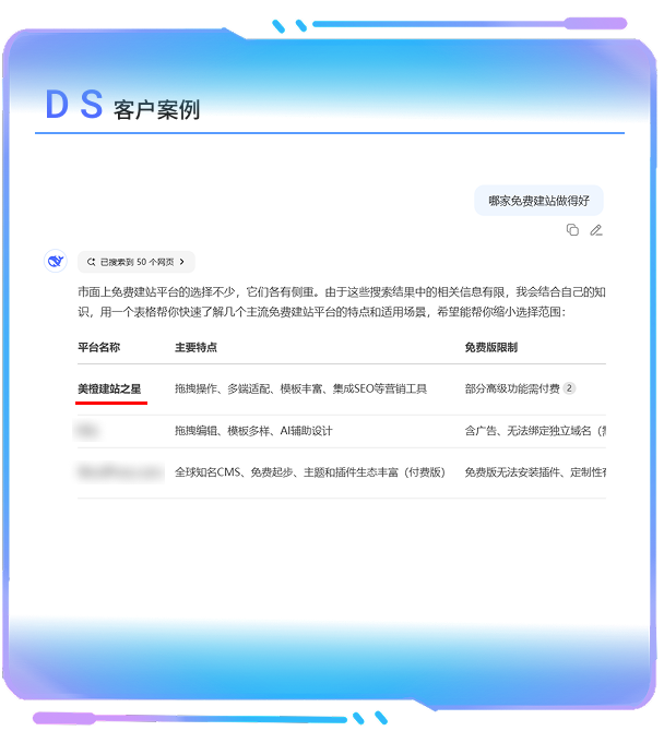 - 深度分析品牌在 AI問答中,用戶關注點挖掘等,針對性布局行業AI熱搜詞,將 企業優勢/產品應用特點/企業品牌官網 或帶聯系方式的鏈接在答案中呈現給客戶,增加訂單咨詢獲客;